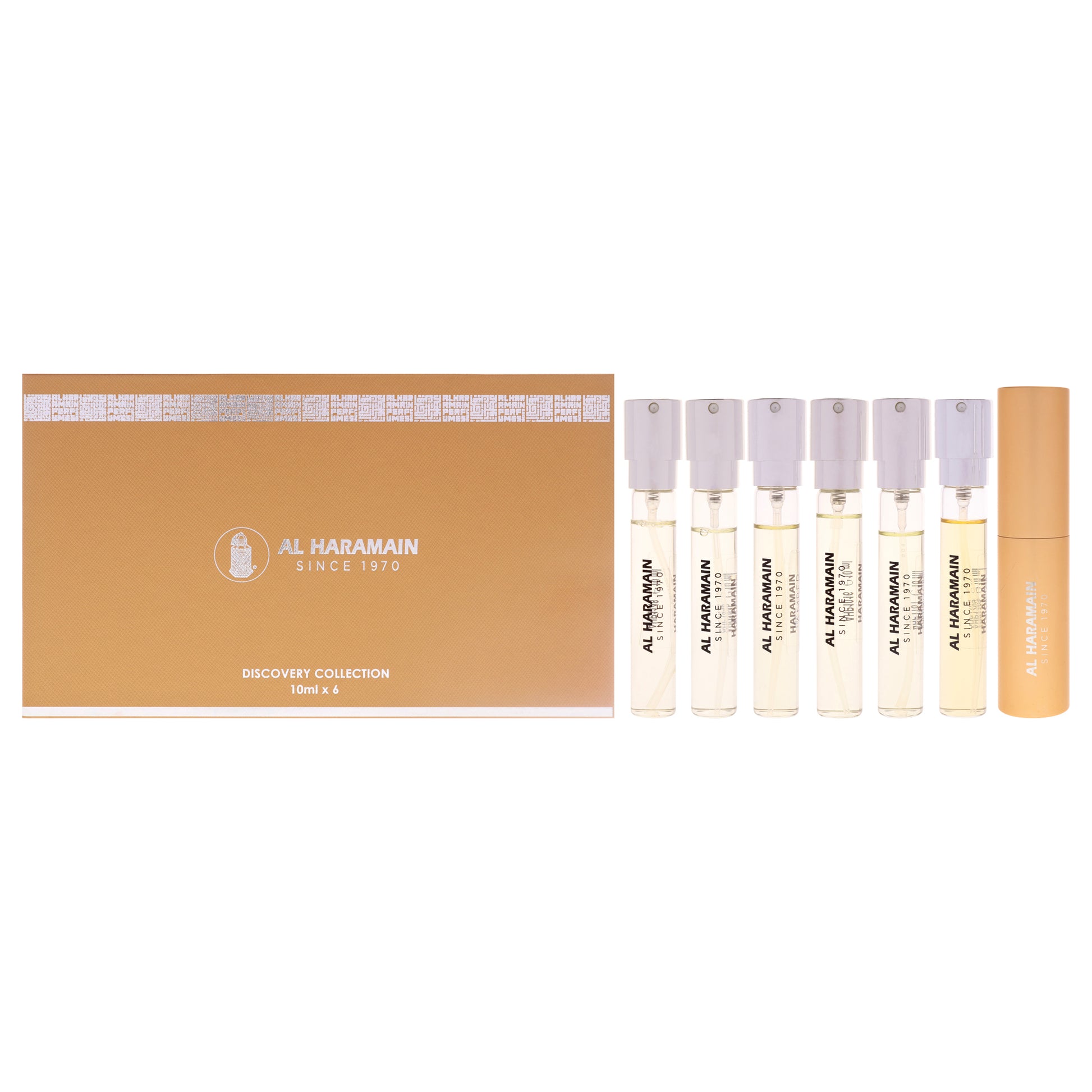 Name: Discovery Collection - Amber Oud by Al Haramain for Unisex - 7 Pc Mini Gift Set 0.33oz Amber Oud - Gold Edition EDP Spray, 0.33oz Amber Oud - Ultra Violet EDP Spray, 0.33oz Amber Oud - Ruby Edition EDP Spray, 0.33oz Amber Oud - Carbon Edition EDP Spray, 0.33oz Amber Oud - Blue Edition EDP Spray, 0.33oz Amber Oud - White Edition EDP Spray, Perfume Atomiser